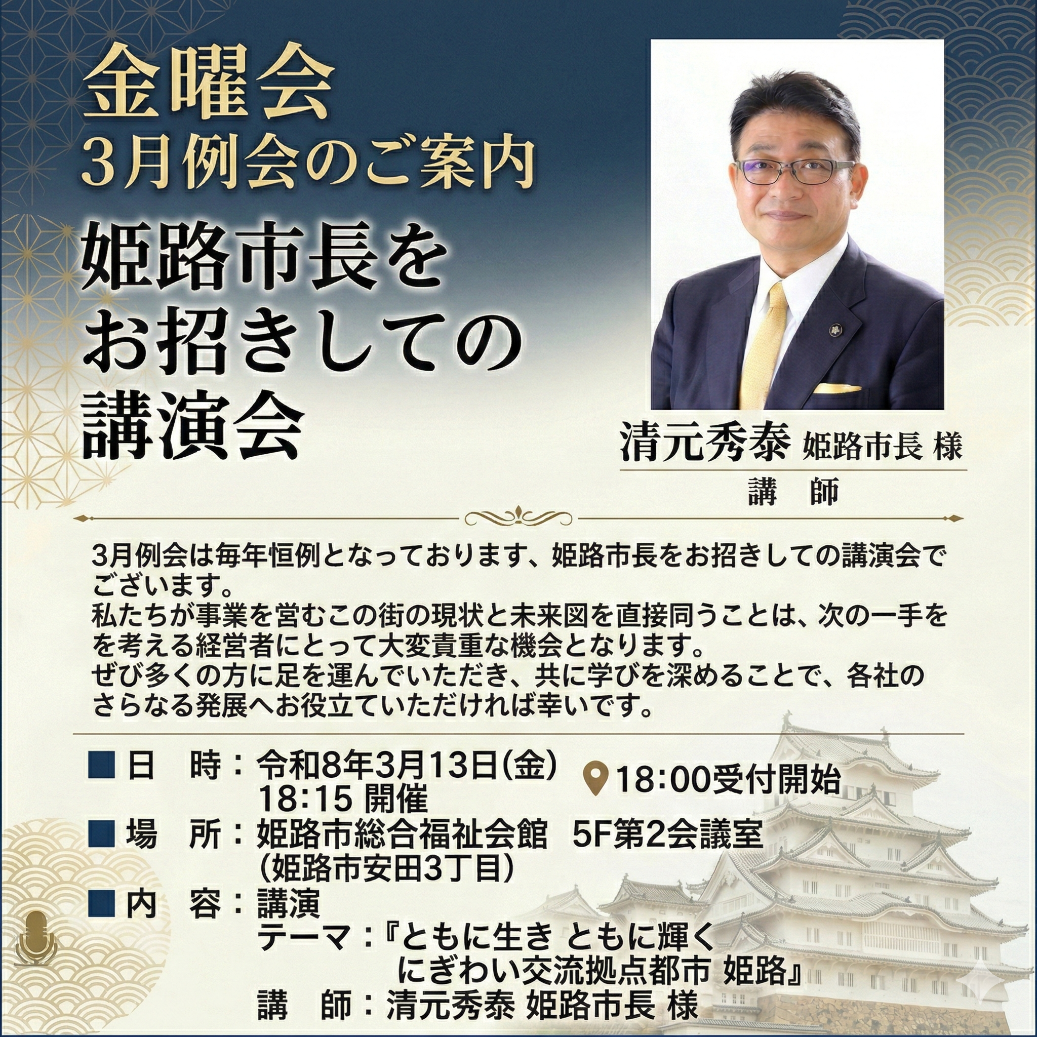 これからも金曜会は、志を同じくする経営者の皆さまと共に歩み、変化の激しい時代を力強く乗り越えてゆく所存です。どうぞ今後とも、変わらぬご支援とご協力を賜りますよう、心よりお願い申し上げます。